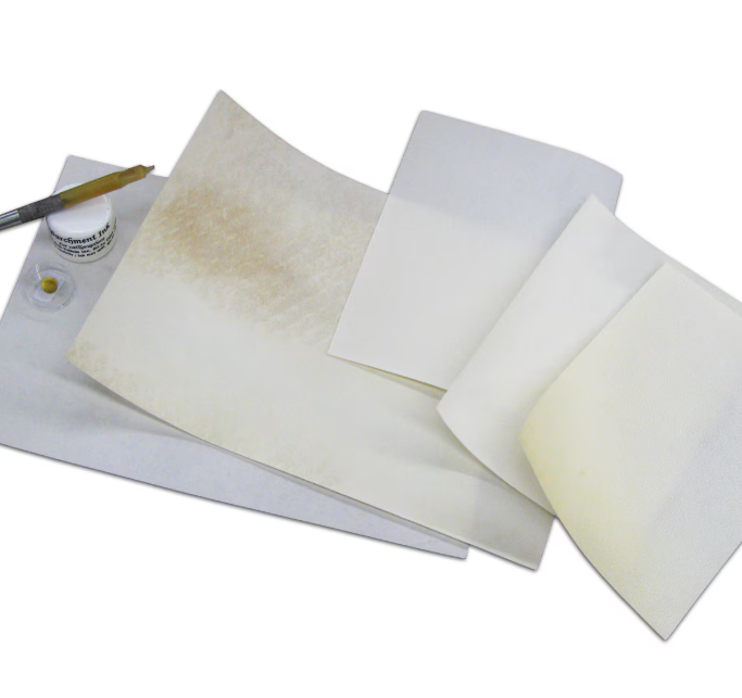 Estas son las mejores piezas de piel de becerro, oveja y cabra, cortadas a medida para manuscritos, producidas por Cowley's en Inglaterra. Las piezas cortadas son una alternativa a la compra de pieles enteras de un animal en particular. Todas las piezas cortadas han sido preparadas para escribir e iluminar por ambos lados, aunque puede ser necesaria una preparación adicional según las preferencias personales.